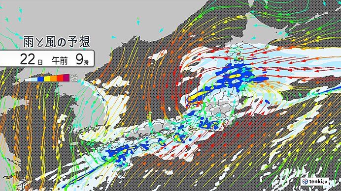明日22日正午までに予想される雨量は、多い所で、東北150ミリ、関東甲信120ミリ、東海180ミリ、近畿150ミリ、中国地方180ミリ、四国200ミリ、九州北部150ミリ、九州南部150ミリ、沖縄80ミリとなっています。